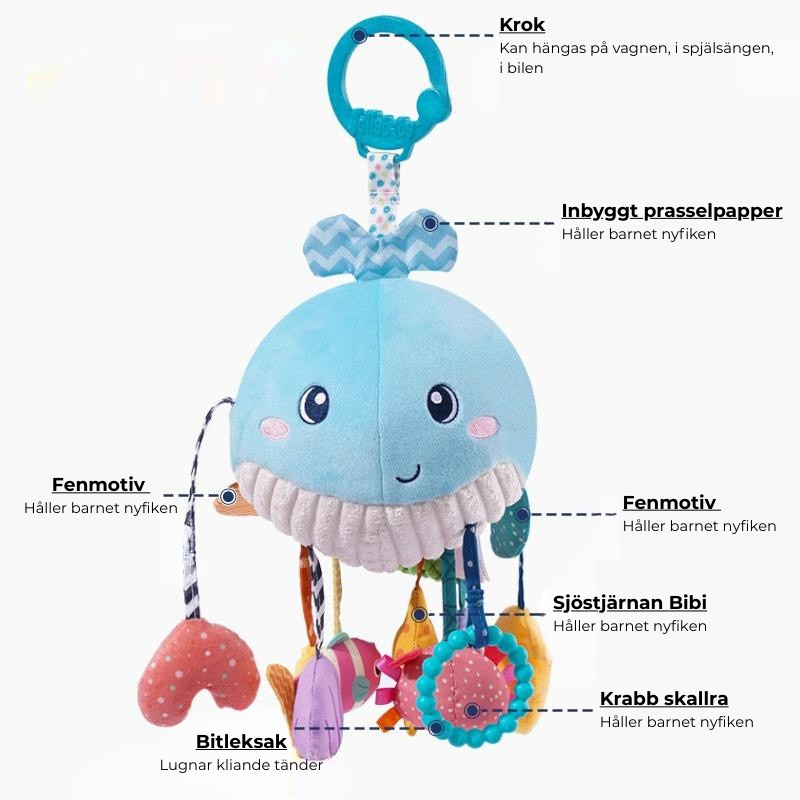 Gör vardagen lite roligare för din bebis med denna mångsidiga och färgglada hängleksak! Den kan enkelt fästas på bilbarnstol, barnvagn, babygym eller spjälsäng och ger barnet något tryggt och stimulerande att utforska oavsett var ni befinner er.